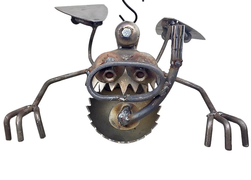 Recycled metal frog sculpture with all the diver’s details is made from recycled world-wide junk. Fred Conlon crafts some pretty wicked pieces- and Scuba Frog is no exception.